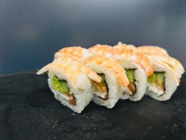 Sūris Philadelphia, agurkas, krevetės, ungurys, Teriyaki padažas, jūros dumblių lapas, ryžiai - 8 vnt.