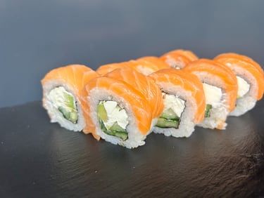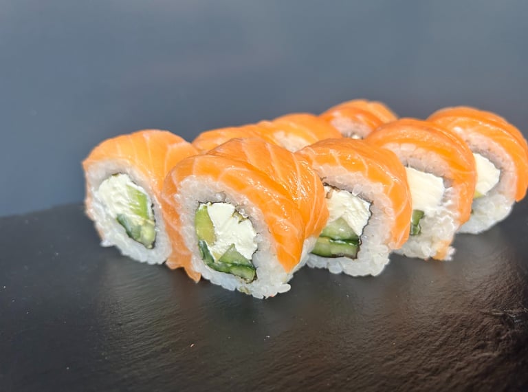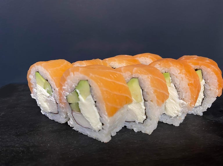 Philadelphia sūris, avokadas, agurkas, lašiša, jūros dumblių lapas, ryžiai - 8 vnt.