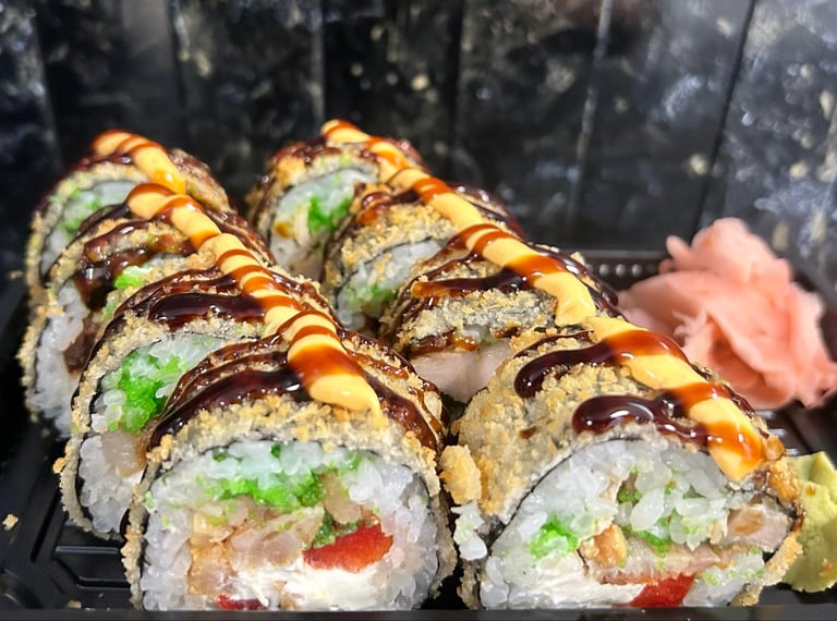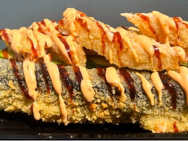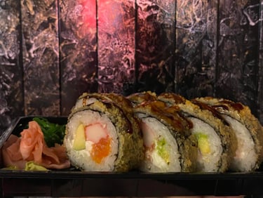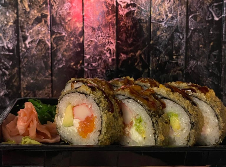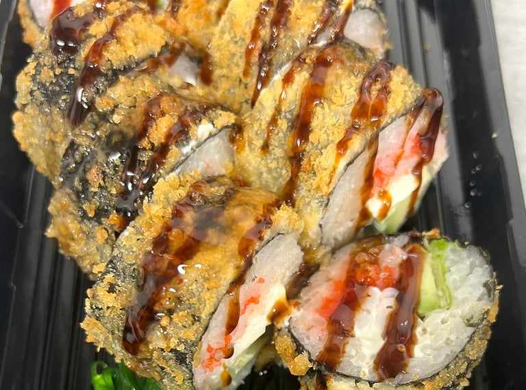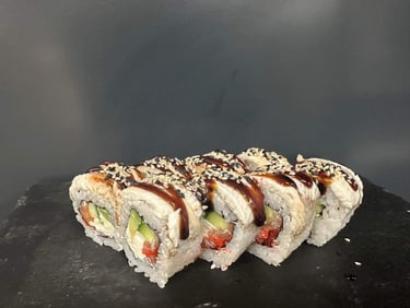 Ryžiai, jūros dumblių lapas, sūris, avokadas, agurkas, lašiša, Panko džiuvėsėliai, Karai padažas, Unagi padažas, ikrai, sezamas