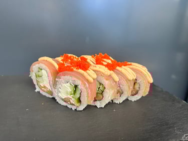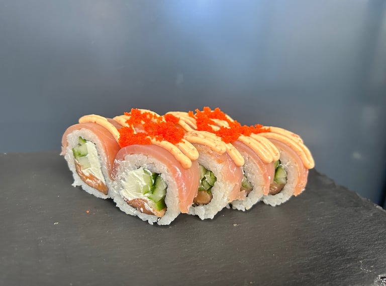Deginta lašiša, krevetė Torpedo, sūris Philadelphia, agurkas, ryžiai, jūros dumblių lapas, spicy padažas - 8 vnt.
