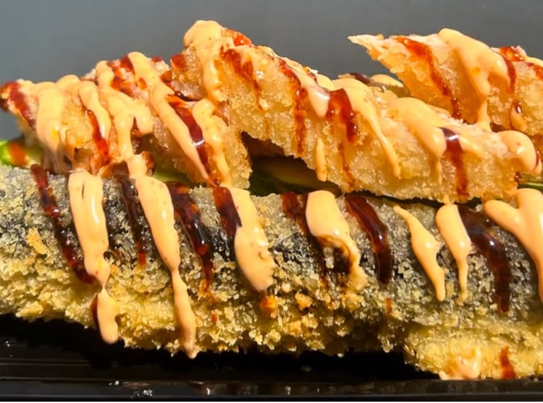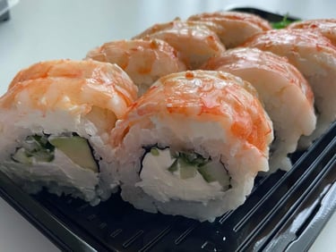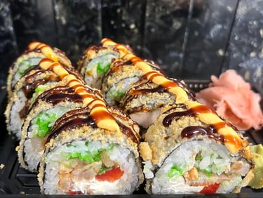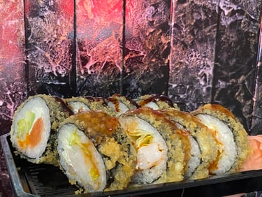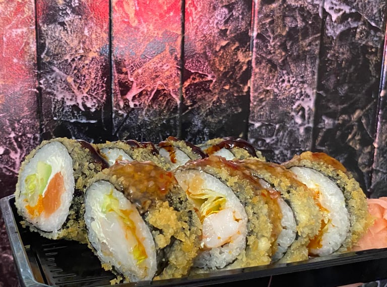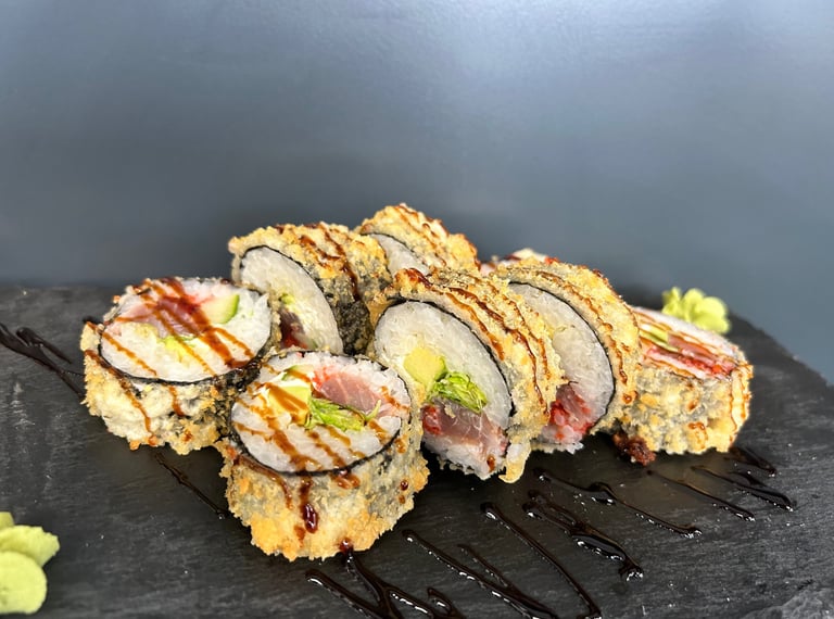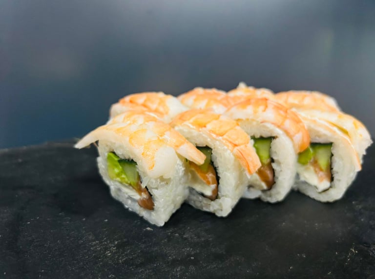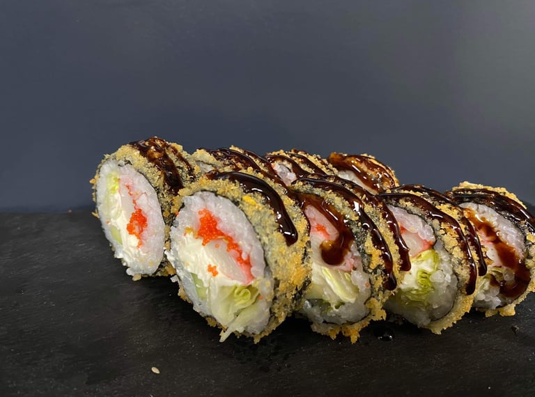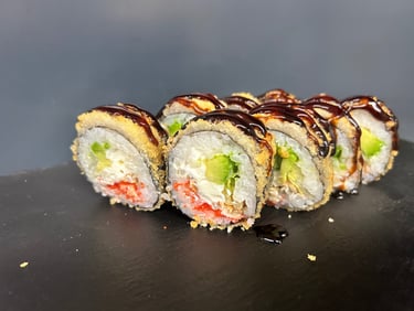 Krevetės, avokadas, ikrai, sūris Philadelphia, sweet čili padažas, jūros dumblių lapas, ryžiai, Panko džiuvėsėliai - 8 vnt.