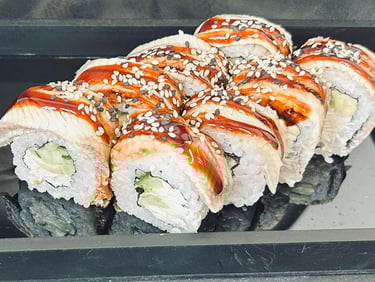 Philadelphia sūris, avokadas, agurkas, ungurys, Unagi padažas, sezamas, jūros dumblių lapas, ryžiai - 8 vnt.