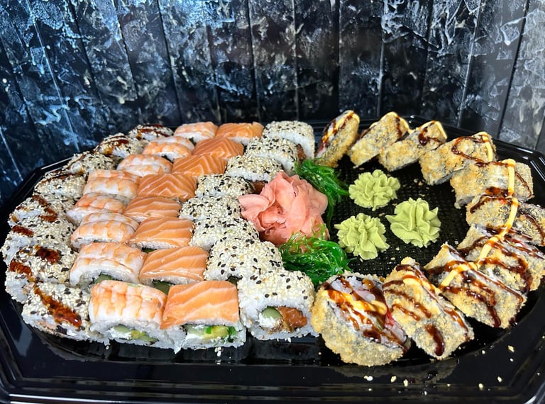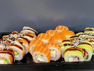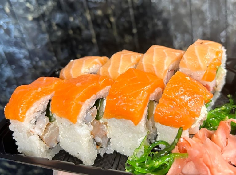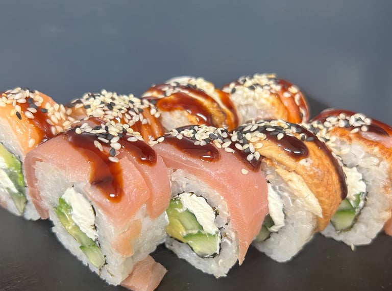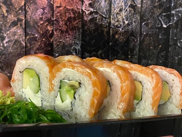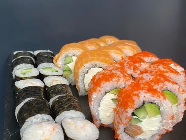 Lašiša, tunas, ungurys, Unagi padažas, sezamas, agurkas, avokadas, salota Iceberg, Philadephia sūris, jūros dumblių lapas, ryžiai - 8 vnt.