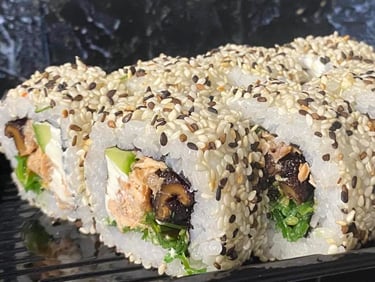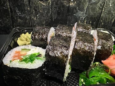 Kepta lašiša, Shiitake grybai, ikrai, ryžiai, Wakami salota, jūros dumblių lapas - 8 vnt.