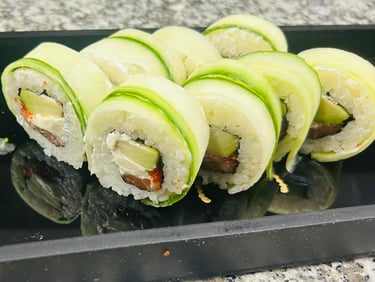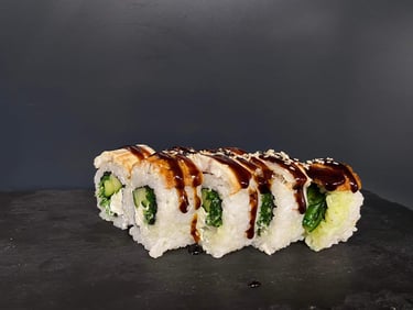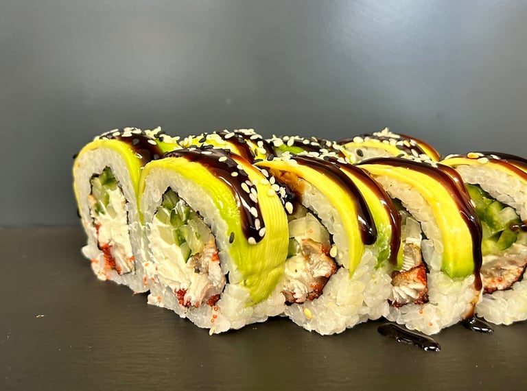 Avokadas, agurkas, sezamas, ungurys, Unagi padažas, jūros dumblių lapas, ryžiai - 8 vnt.