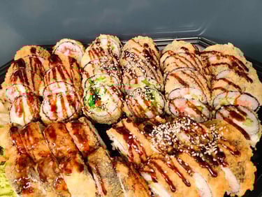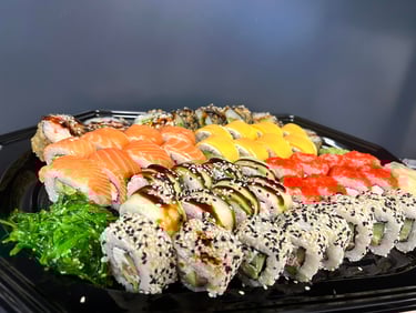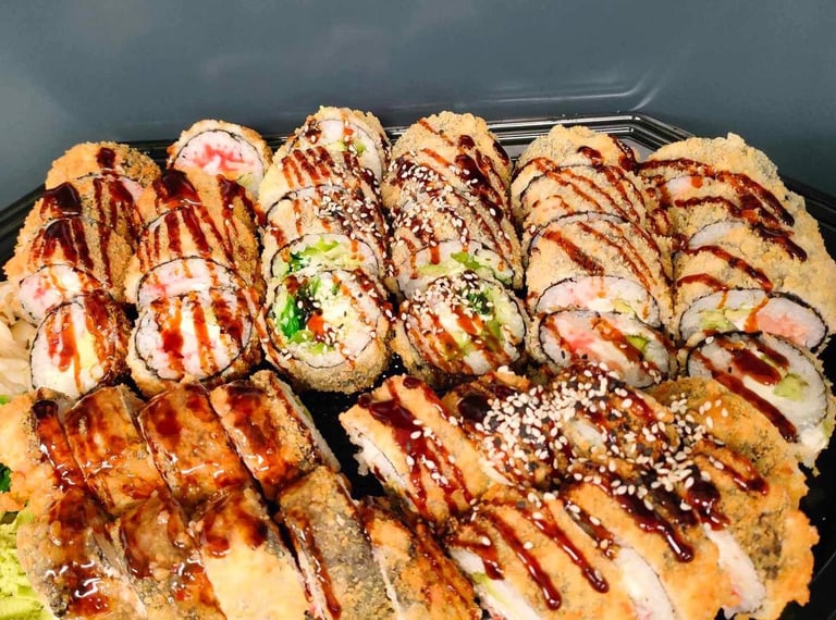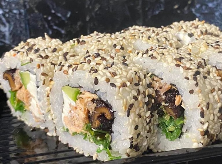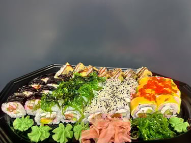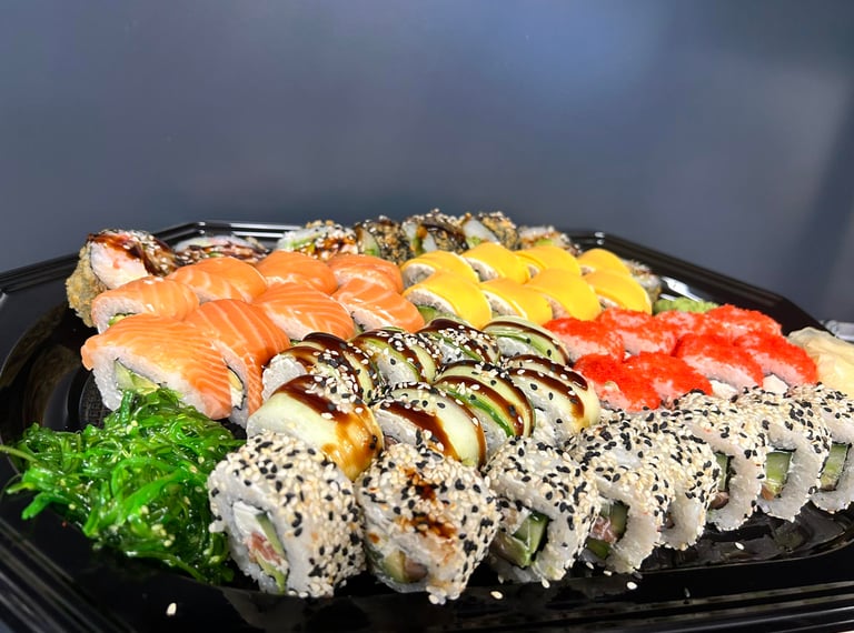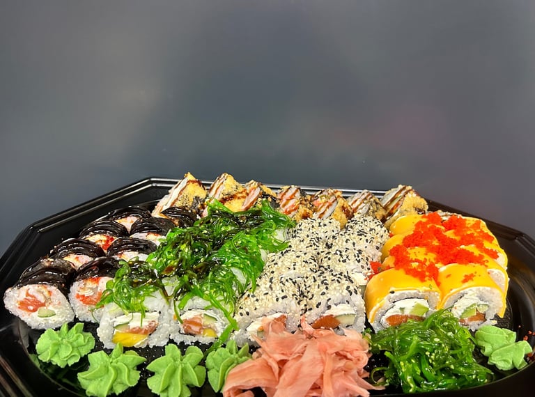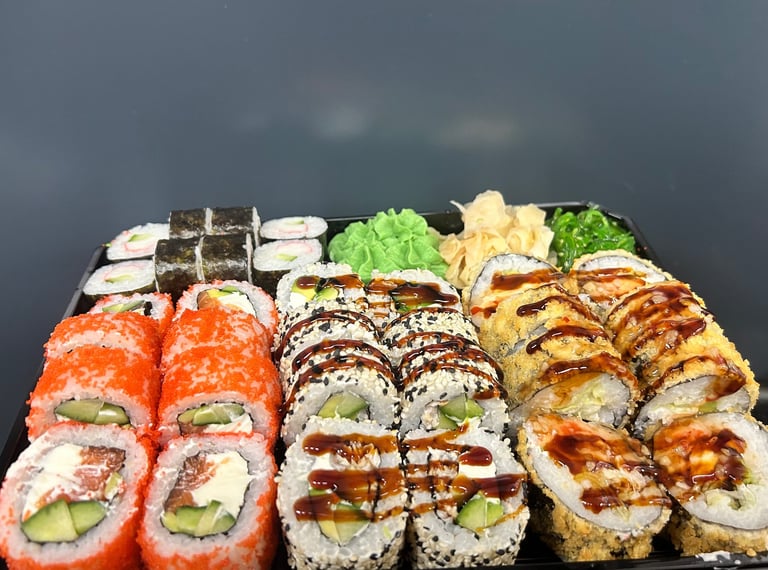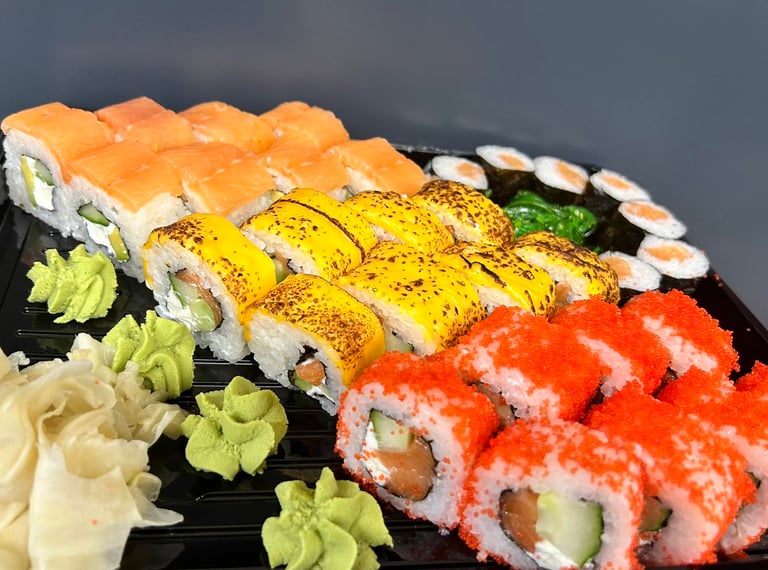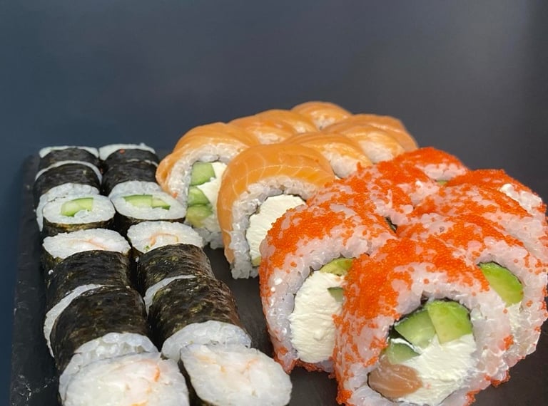 Kalifornija su lašiša ir ikrais, Kalifornija su unguriu ir sezamu, Maki su snieginiu krabu, Keptas su krevete