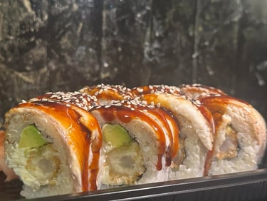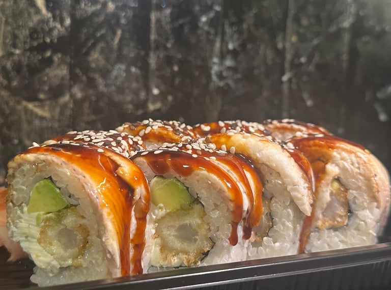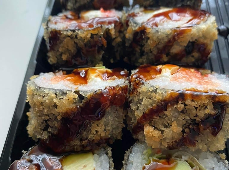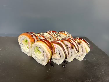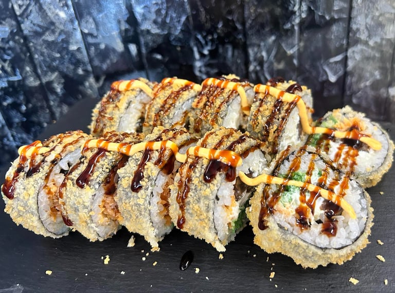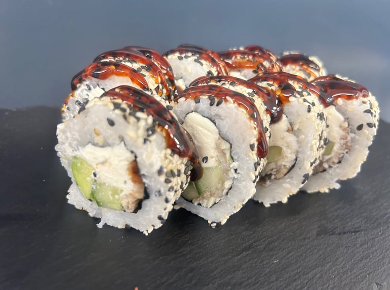 Ungurys, sūris Philadelphia, ikrai, avokadas, Unagi padažas, jūros dumblių lapas, ryžiai, Panko džiuvėsėliai - 8 vnt.