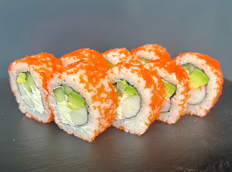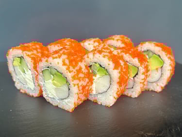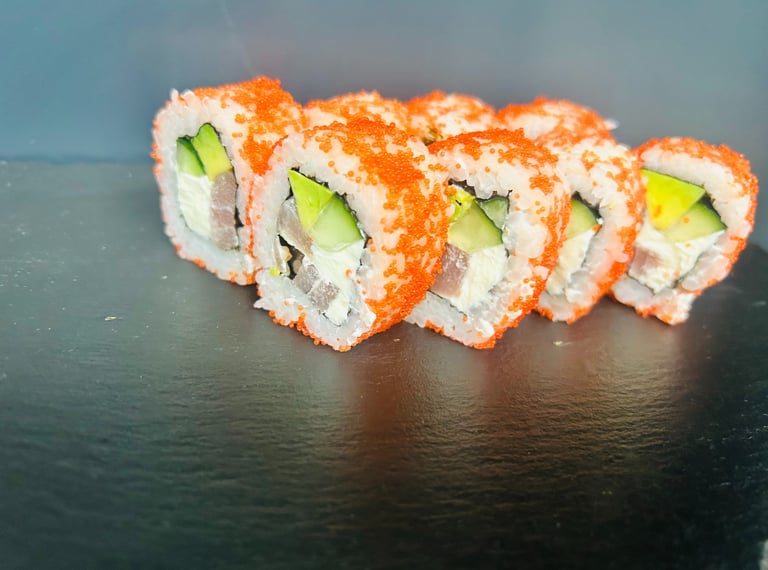 Avokadas, agurkas, sūris Philadelphia, ikrai, lašiša, jūros dumblių lapas, ryžiai - 8 vnt.