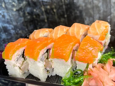 Keptas su snieginiu krabu, Čiz lašiša, Su lašiša ir sezamu, Futomaki mix, Mango