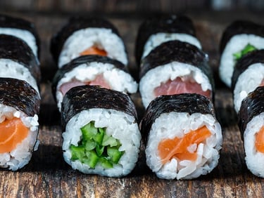 Ryžiai, lašiša, jūros dumblių lapas - 8 vnt.
