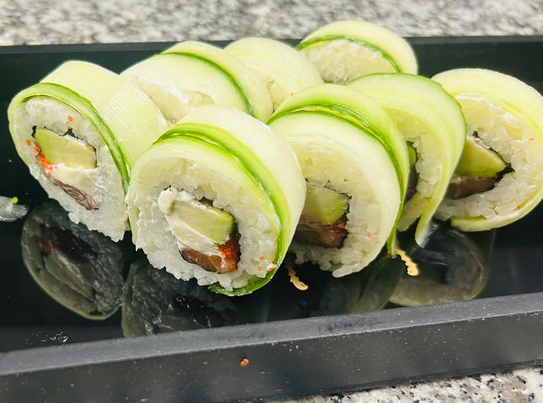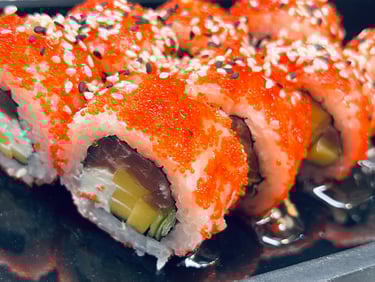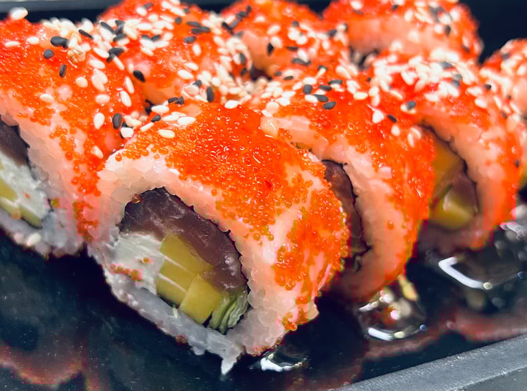 Ryžiai, jūros dumbių lapas, sūris, avokadas, agurkas, tunas, Karai padažas, ikrai, sezamas, Unagi padažas