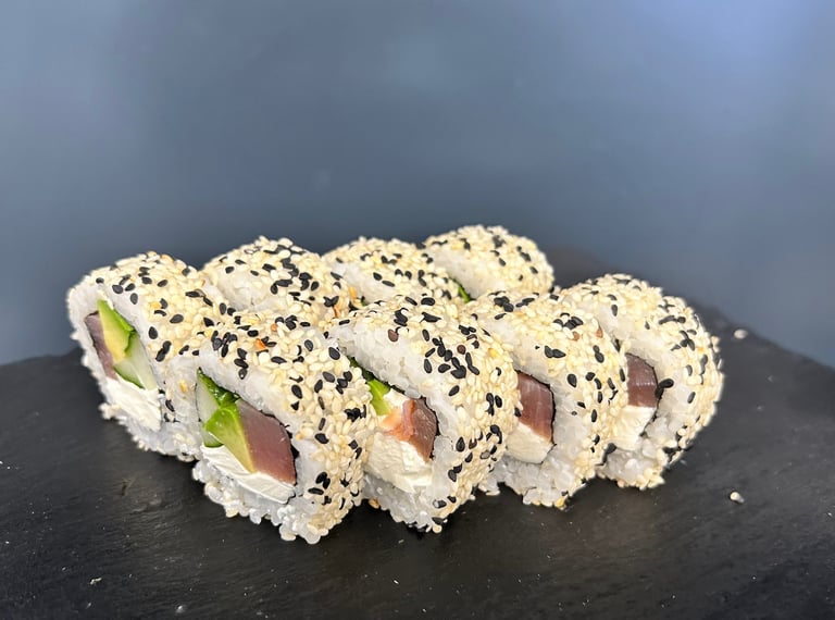 Avokadas, agurkas, sezamas, tunas, jūros dumblių lapas, ryžiai, sūris Philadelphia - 8 vnt.