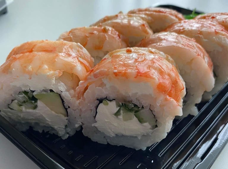 Sūris Philadelphia, avokadas, agurkas, lašiša, krevetės, sweet čili padažas, jūros dumblių lapas, ryžiai - 8 vnt.