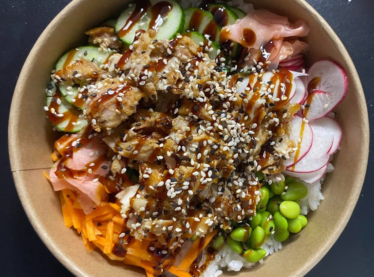 Ryžiai, kepta traški vištiena, agurkas, avokadas, konservuoti kukurūzai, morkos, marinuotas imbieras, sezamas, ridikas, Unagi padažas
