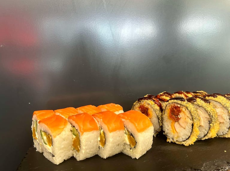 Saki tempūra (Agurkas, sūris, lašiša, tempūros traškučiai, jūros dumblių lapas, ryžiai, sezamas), Keptoji lašiša, Philadelphia su krevetėmis, Keptas su snieginiu krabu, Mango