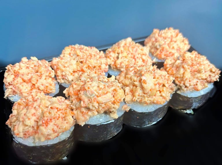 Snieginis krabas, rūkyta lašiša, ikrai, jūros dumblių lapas, ryžiai, avokadas - 8 vnt.