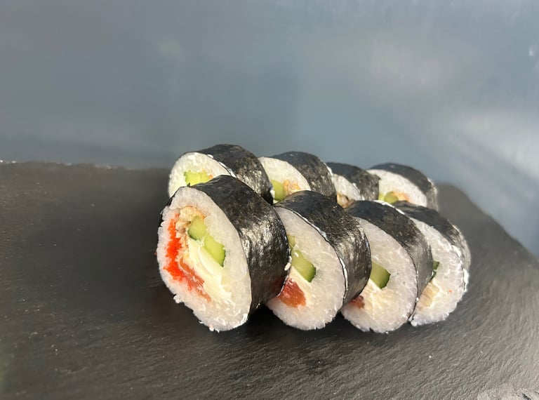 Agurkas, avokadas, sūris Philadelphia, Čederio sūris, ikrai, jūros dumblių lapas, ryžiai, lašiša - 8 vnt.
